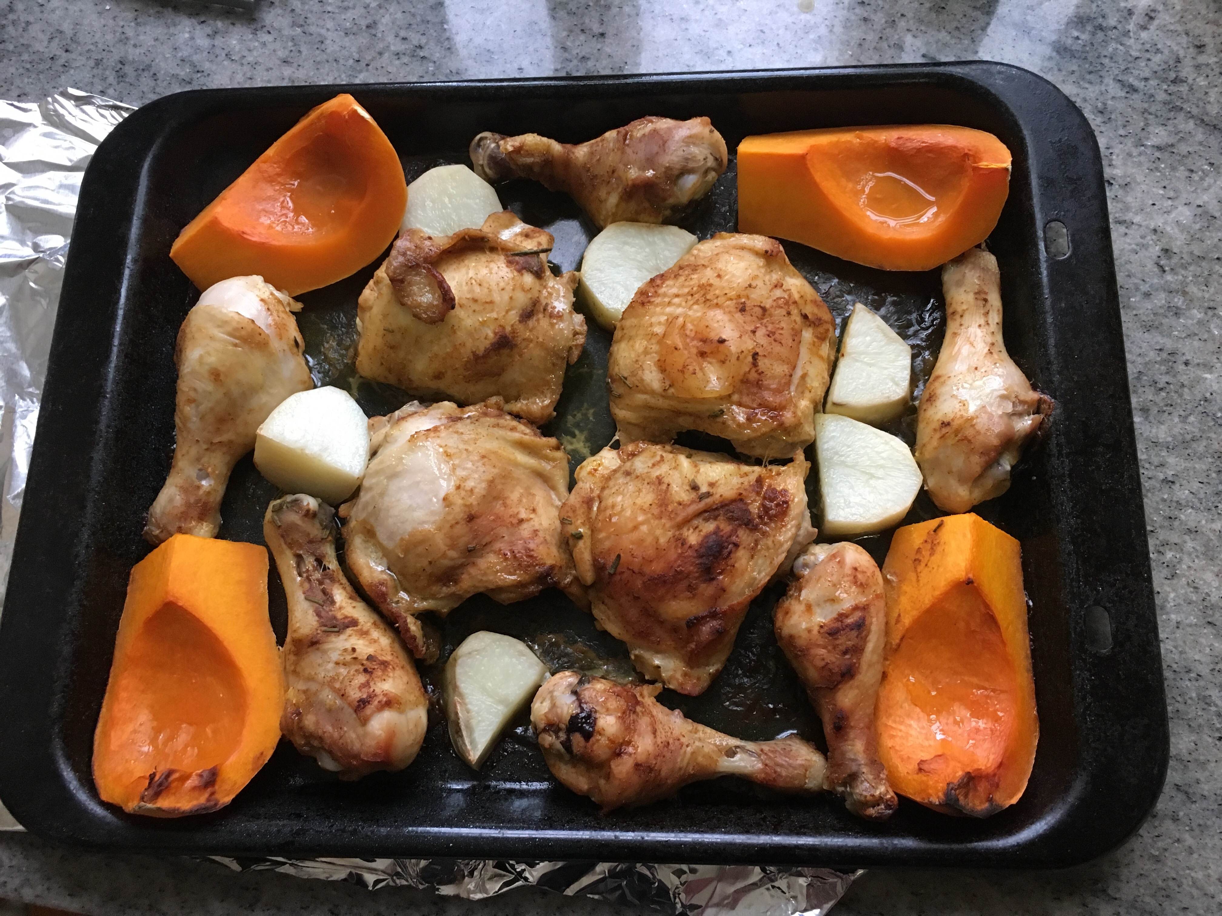 - Spray a roasting pan with oil (I use coconut oil or olive oil) to prevent sticking.