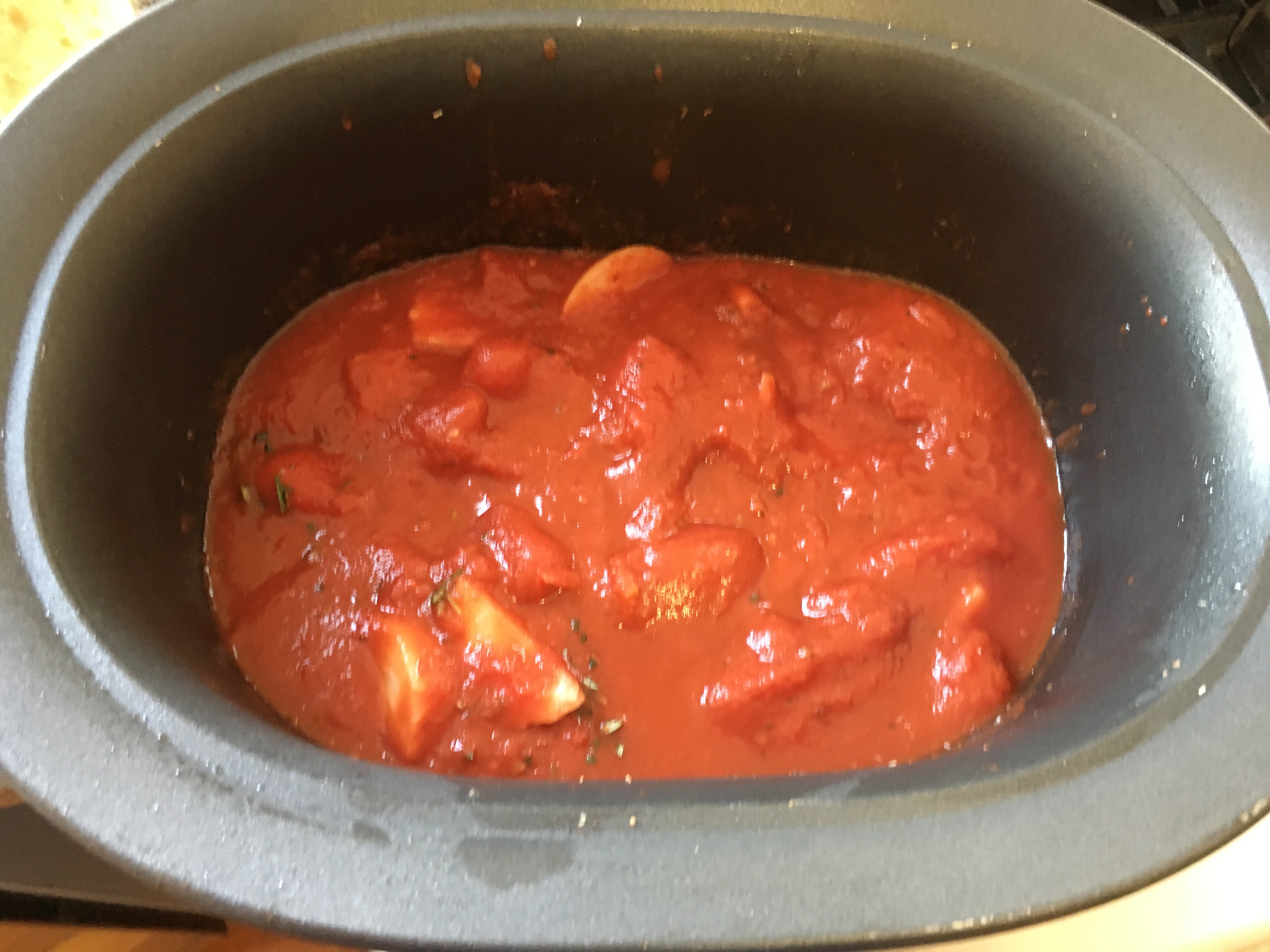 - Gently nestle the meat into the sauce and set your slow cooker on low (7.5 to 9.5 hours).