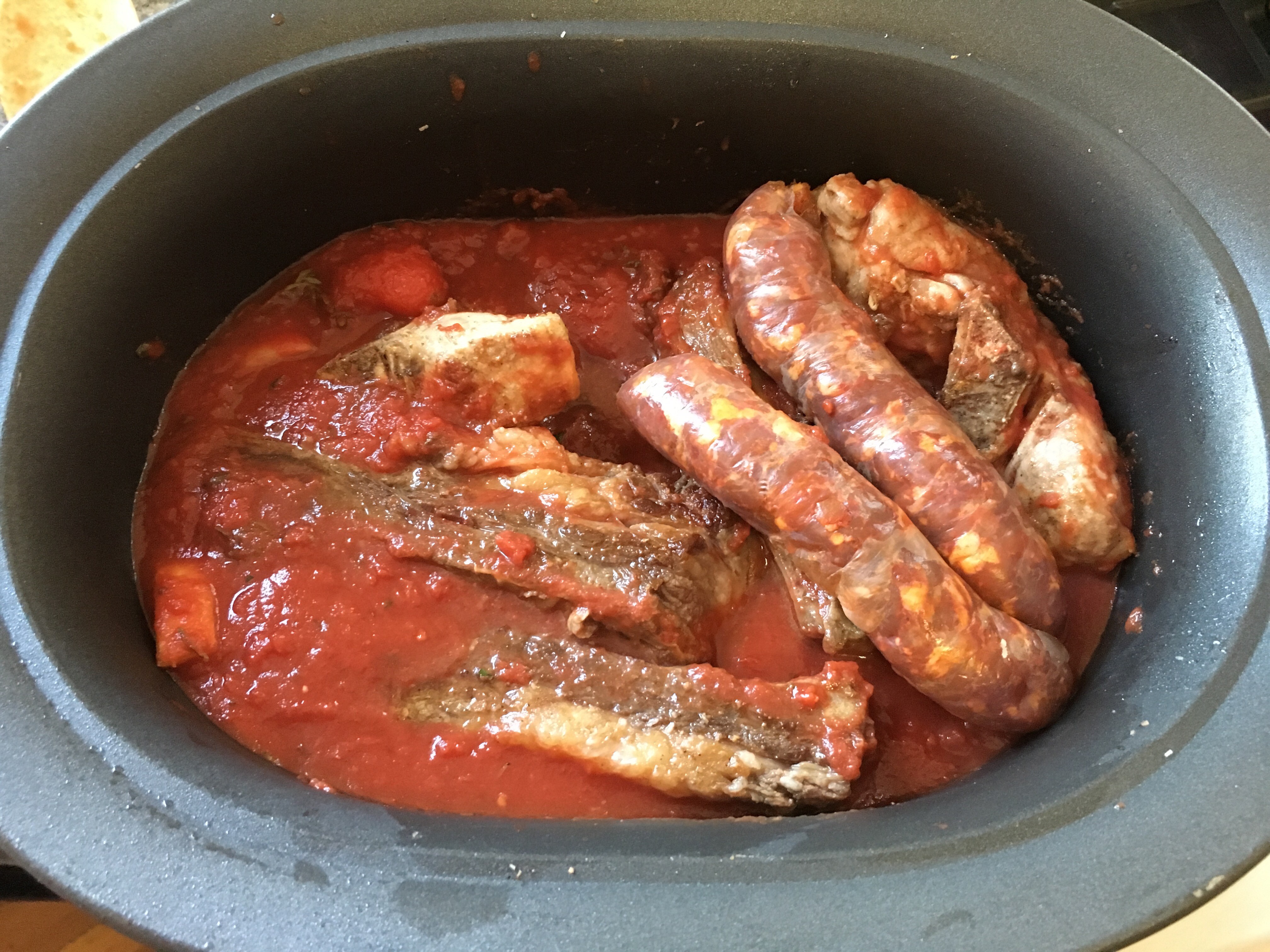 - Consider Variation C – Use the ingredients I did – but remove the meats sooner and remove the fat/bones from the short ribs after about 7 1/2 hours — also note that the sausage & country style ribs will likely cook faster.