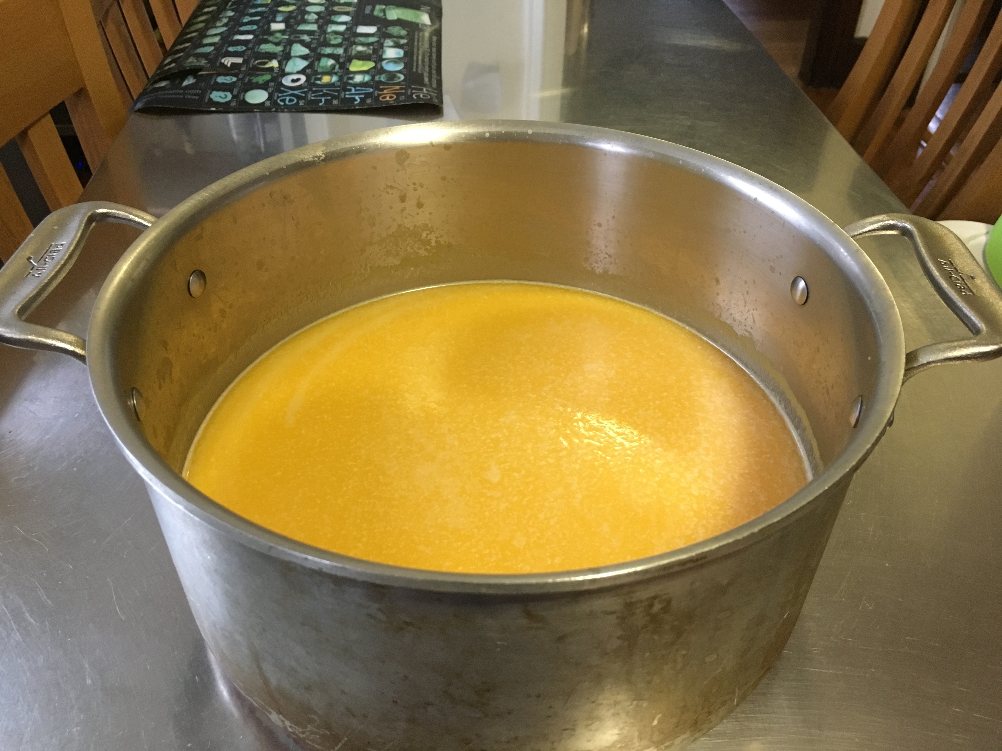Using an immersion blender: ?I have an immersion blender (a wonderful gift from my sister) and if using, you will only need to move the pan to the counter and carefully blend until the vegetables are pureed.