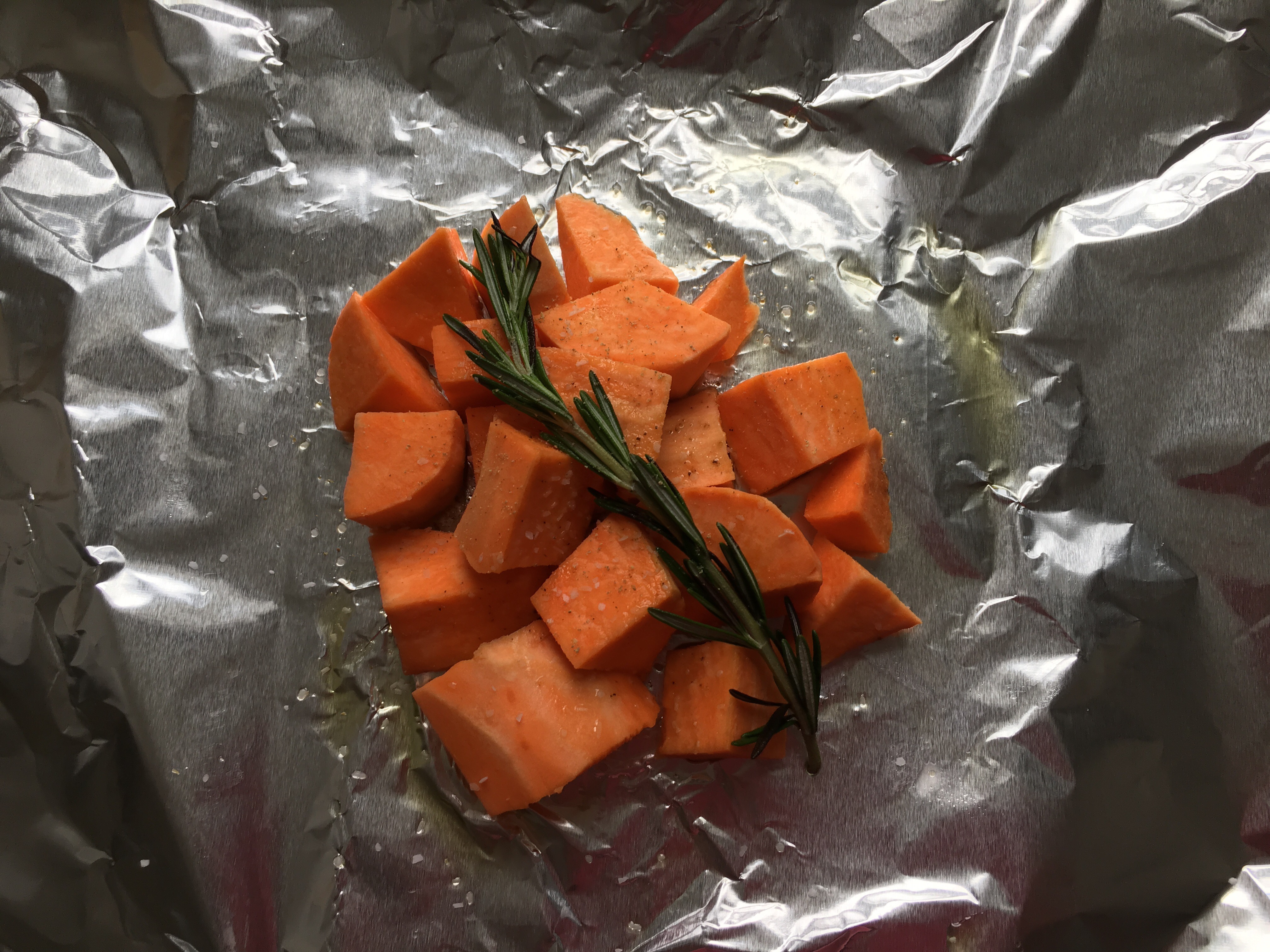 - Place enough sweet potato (i.e. 1 ? 2 potatoes) for your family (or the sweet potato eating subset thereof) onto a small baking dish or into a large rectangular sheet of aluminum foil.