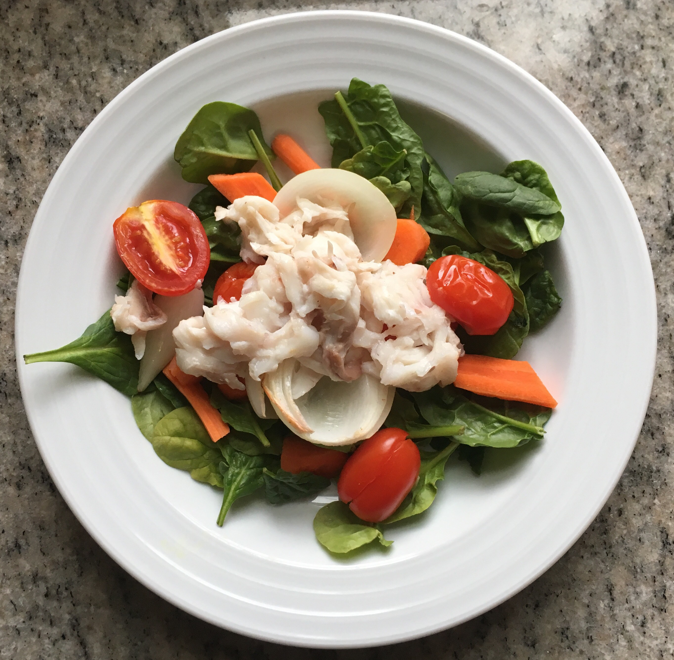- Once the fish comes out of the oven, put roasted onions and grape tomatoes on top of each salad.